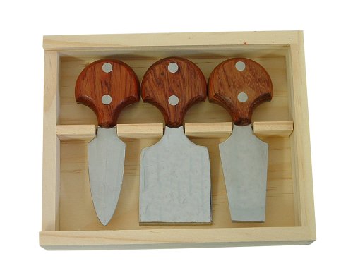 - 3-piece specialty cheese knife set with rosewood handles and wooden crate