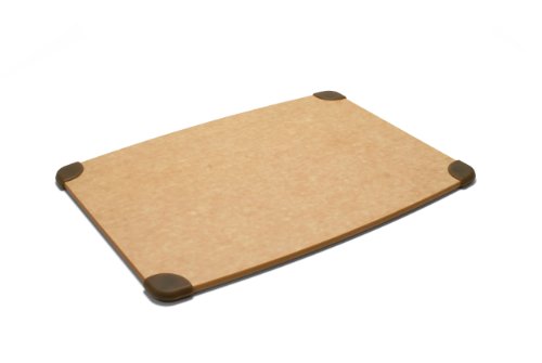Epicurean Cutting Surfaces are a practical and distinctive improvement from poly, glass and wood cutting boards. They have all of the best qualities and none of the bad-in one highly functional surface. Every design is thoughtfully detailed for functionality in use, clean up and storage. All Epicurean Cutting boards are designed to fit in the dishwasher and many of our boards are NSF approved, so that you can be assured that they will be easy to clean and will not harbor bacteria. Cutting on Epicurean Cutting Surfaces will not dull your knives because the surface will score slightly, which helps it protect your knife's edge. These boards are made with a non-porous wood fiber composite from trees harvested under guidelines of the North America Sustainable Forestry Standards. Epicurean Cutting Surfaces resist staining and cracking, and are heat resistant up to 350°. Manufactured in the USA . Epicurean Cutting Surfaces non-slip Gripper Surfaces are a perfect solution for smooth and damp preparation areas and for people who like more countertop grip during food prep. The corner placement of the silicone grippers elevates the surface off of your countertop while holding the surface in place and preventing it from slipping under the knife. The silicone grippers are removable and it's all dishwasher safe. This board measures 12" x 9", 1/4" thick, natural color board with brown silicone grippers.
