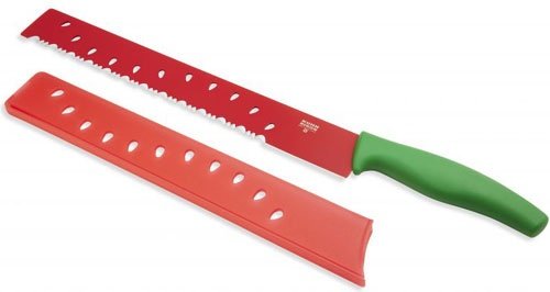 Cut into the juicy flavors of melons with the Kuhn Rikon Nonstick Melon Knife Colori. Fun and functional, it's unmistakably designed for use with melons, with its green handle and long red blade decorated with a whimsical seed cut-out design. Cleanly and safely slices through thick skins of cantaloupe, honeydew or watermelon. Ergonomic handle is designed to help you maintain your grip while applying pressure to cut through tough melon skins.. Seed-shaped cut-outs prevent sticking and help melon slide off the blade easily. Nonstick coating ensures food will release easily from blade. Red safety sheath, with its decorative seed-shaped accents, coordinates with the whimsical design of the knife and protects blade when not in use