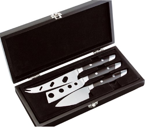 No cheese can escape this practical Cheese Knife set from Cilio. There is an 10-inch perforated knife with prong tip for soft cheese, a 8-1/2-inch perforated knife for hard cheese and an 8-inch parmesan cheese knife. Each sports a smooth black wooden handle. Attractively stored in a handsome, black wooden case.